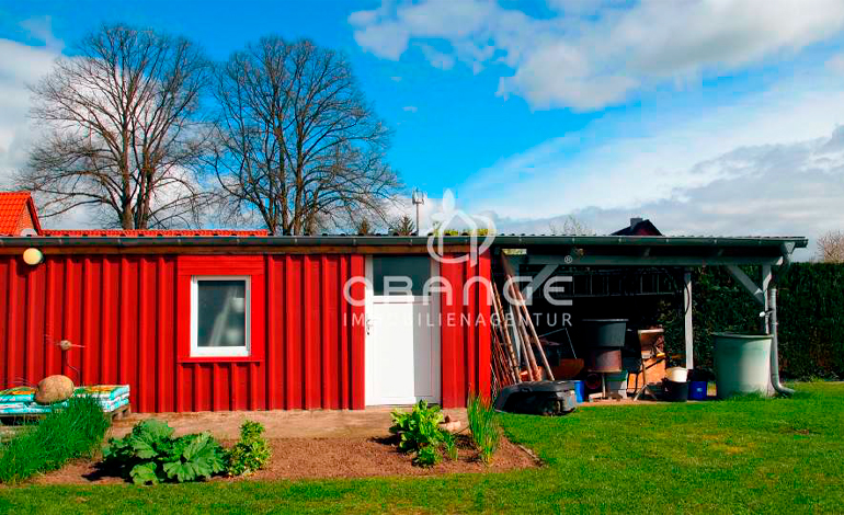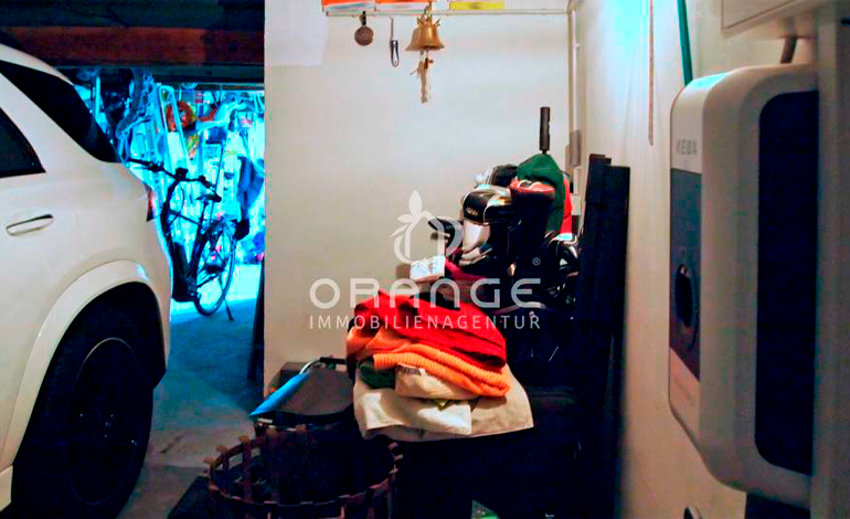 Das Grundstück hat zwei Auffahrten. Die erste führt in eine massiv gebaute Garage mit Aufladestation für E-Autos und bietet Zugang zum auswirtschaftsraum. Hier befinden sich neben Waschmaschine auch Lagermöglichkeiten und ein Eingang zur Küche sowie auf die Terrasse. Hinter der Garage gibt es Platz für eine Werkstatt, Fahrräder und Gartengeräte. Zum weiteren Nebengelass gehört ein Unterstand, um z.B. Brennholz zu lagern.
