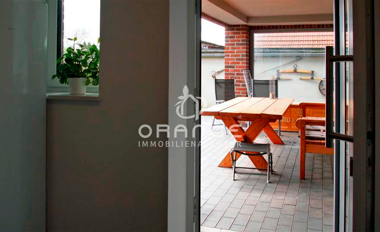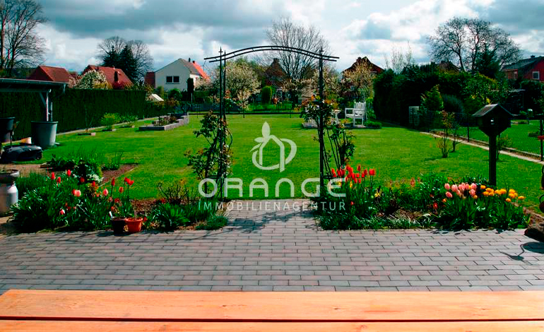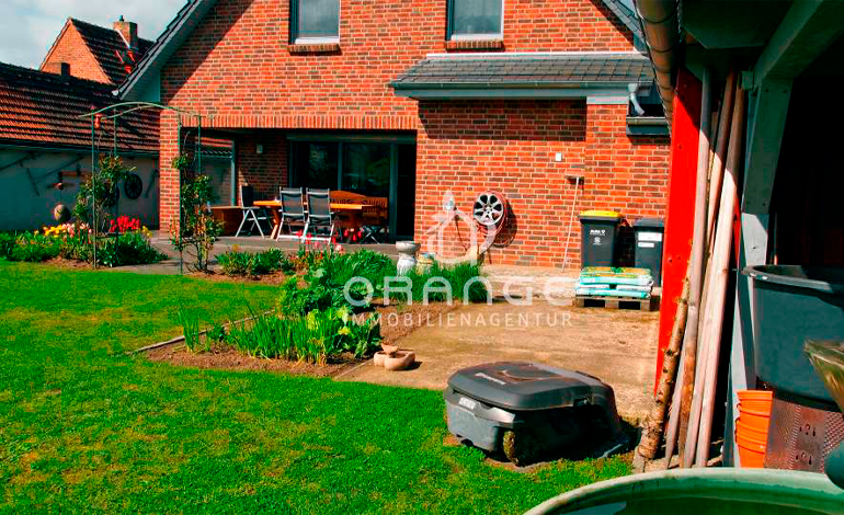 Der Garten ist stilvoll und pflegeleicht gestaltet. Neben dem Hochbeet und einigen Obstbäumen bietet eine „Abendterrasse“ im hinteren Teil genau das richtige Ambiente, um den Sonnenuntergang zu genießen und den Tag ausklingen zu lassen. Am besten nach einem schönen Grillabend auf der großen Terrasse mit Südausrichtung vor dem Wohnzimmer. Ein Teil ist überdacht, so dass eine Outdoor-Küche auch bei trüben Wetter gut funktioniert.