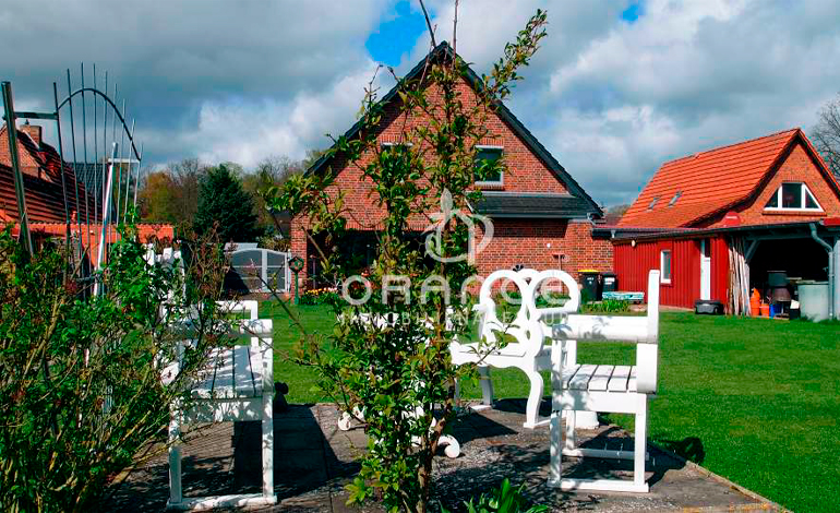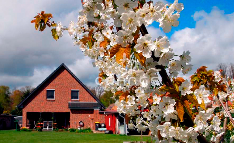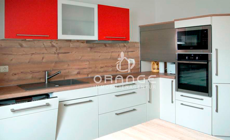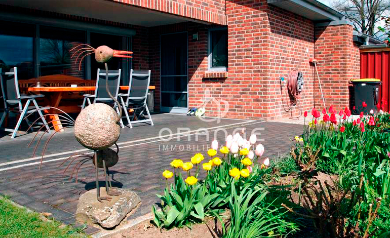 Der Garten ist stilvoll und pflegeleicht gestaltet. Neben dem Hochbeet und einigen Obstbäumen bietet eine „Abendterrasse“ im hinteren Teil genau das richtige Ambiente, um den Sonnenuntergang zu genießen und den Tag ausklingen zu lassen. Am besten nach einem schönen Grillabend auf der großen Terrasse mit Südausrichtung vor dem Wohnzimmer. Ein Teil ist überdacht, so dass eine Outdoor-Küche auch bei trüben Wetter gut funktioniert.